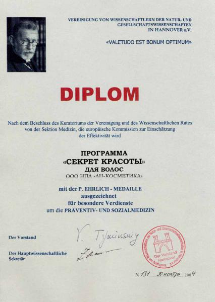 Программа «Секрет Красоты» для волос ООО НПЛ «ЛН–Косметика» награждена медалью им. П. Эрлиха за особые заслуги в области социальной и профилактической медицины. Решение попечительного совета союза ученых и научного совета секции медицины. Европейская Комиссия по оценке эффективности. №131 от 30 ноября 2004.