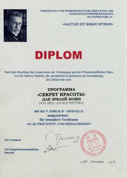 Программа «Секрет Красоты» для зрелой кожи ООО НПЛ «ЛН–Косметика» награждена медалью им. П. Эрлиха за особые заслуги в области социальной и профилактической медицины. Решение попечительного совета союза ученых и научного совета секции медицины. Европейская Комиссия по оценке эффективности. №130 от 30 ноября 2004.